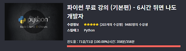 "가장 큰 위험은 위험없는 삶이다." - 스티븐 코비 "The greatest risk is the risk of riskless living."" - Stephen Covey 안녕하세요. 지식공유 사이트인 인프런(inflearn)에서 파이썬 기초 무료 강의를 수강하고 후기를 남깁니다. 1. 강의 개요 ○ 제 목 : 파이썬 무료 강의 (기본편) - 6시간 뒤면 나도 개발자 ○ 강의 언어 : 파이썬(Python) ○ 강 사 : 나도코딩(NaDoCoding) ○ 링 크 : https://www.inflearn.com/course/%EB%82%98%EB%8F%84%EC%BD%94%EB%94%A9-%ED%8C%8C%EC%9D%B4%EC%8D%AC-%EA%B8%B0%EB%B3%B8# → 또는 구글에서 '6시간 뒤..