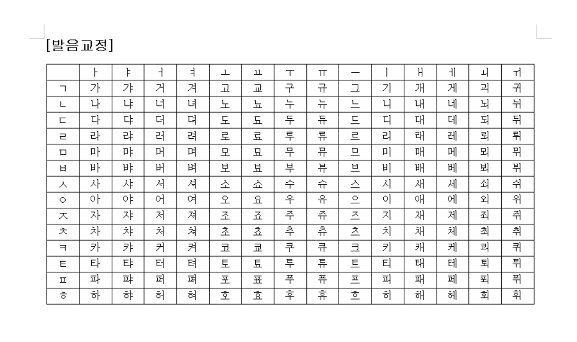 | ㄱ | 가 | 갸 | 거 | 겨 | 고 | 교 | 구 | 규 | 그 | 기 | 개 | 게 | 괴 | 귀 |
