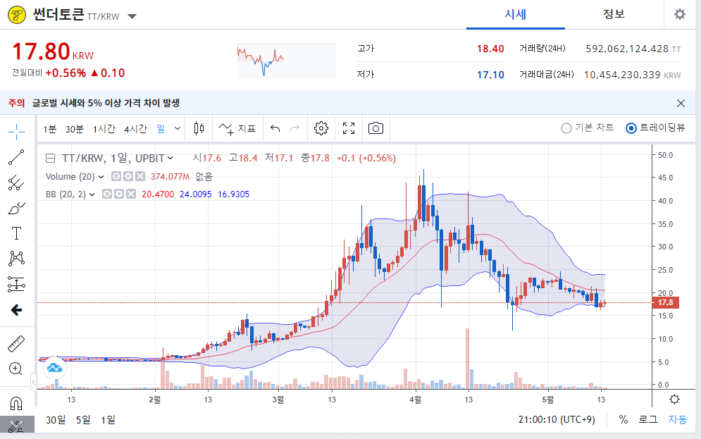 국내거래소 업비트에 썬더토큰(TT) 5월 14일 기준 17.80원