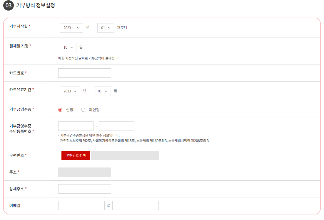 7. 기부방식 정보를 설정합니다. 이때, 기부 시작하는 월과 기부금영수증 신청 여부를 작성하실 수 있습니다.