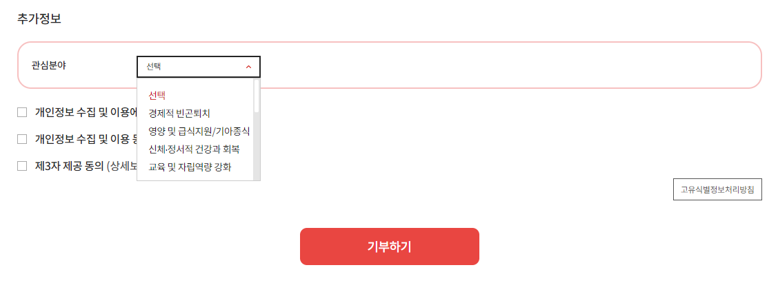 8. 마지막으로 관심분야와 개인정보 동의를 하고 '기부하기' 버튼을 누르면 끝입니다.