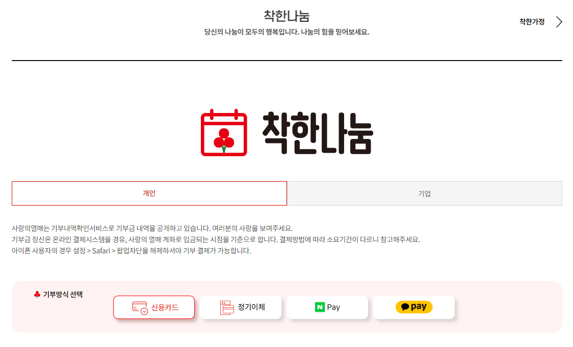 5. '개인 또는 기업'으로 기부할 수 있고, 기부 방식은 '신용카드, 정기이체, 네이버페이, 카카오페이'로 총 4가지가 있습니다.