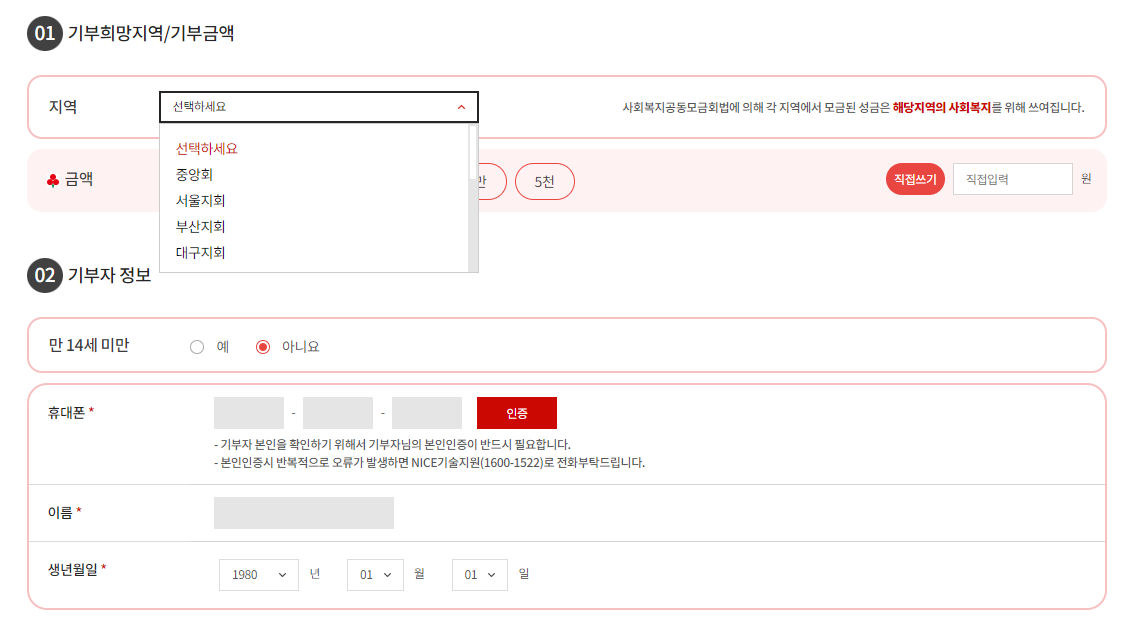 6. 기부희망지역, 기부금액, 기부자 정보를 입력합니다.