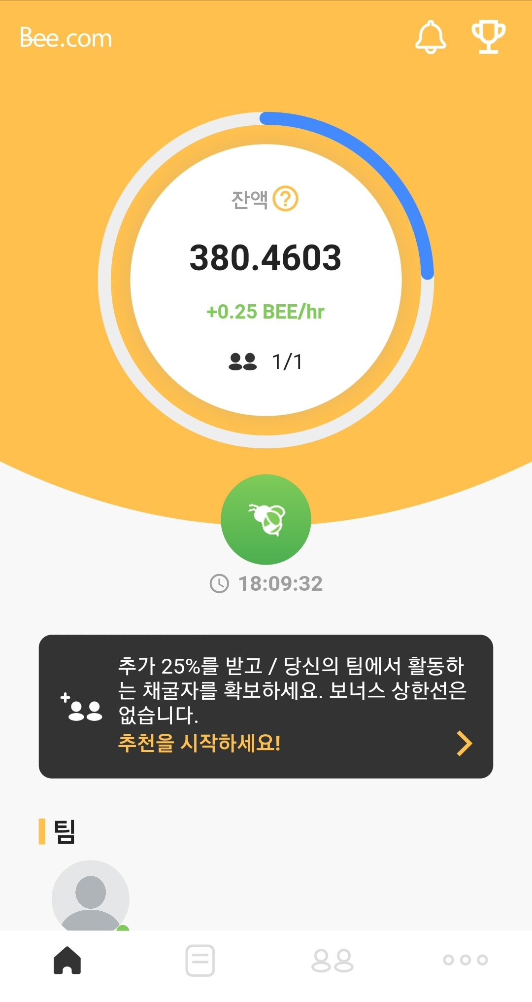 - 채굴 버튼은 없으며, 매일 출석하는 것으로 채굴이 가능하다