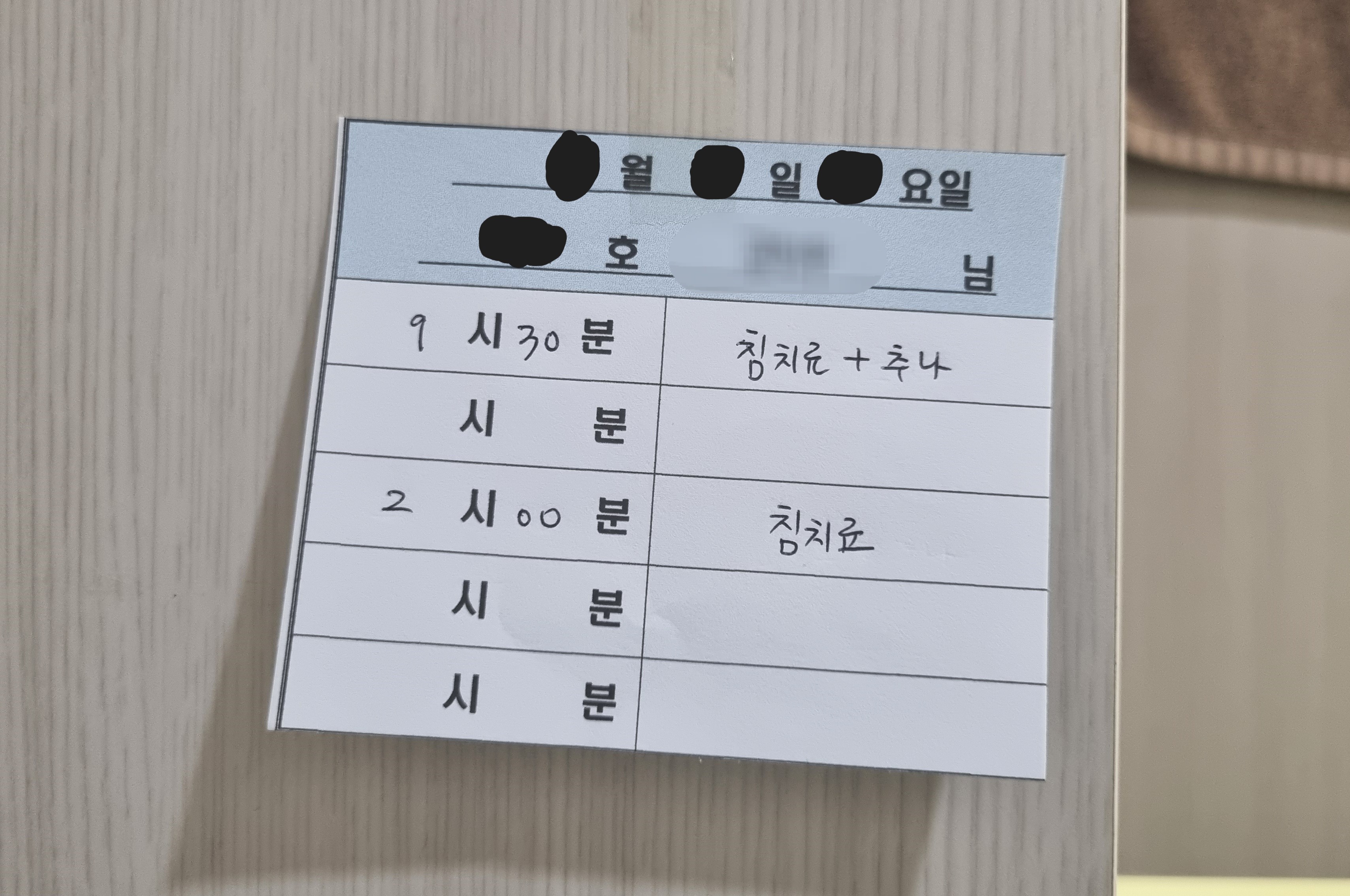 추나 치료도 마찬가지로 한의사 선생님들이 진행해주시는데, 입원실을 운영하고 여러 한의사 선생님들이 교대로 근무하셔서 그런지 서비스가 좋았습니다. 침은 처음엔 무서운 줄 모르고 그냥 회복해야하니까 받았는데, 며칠 받고나니 회복에 많은 도움이 된 것 같습니다.